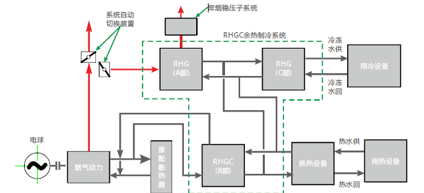 在机组发电的同时,采用RHGC(A部)回收发电机排烟余热,采用RHGC(B部)回收冷却水余热,两者合并构成动力热源。