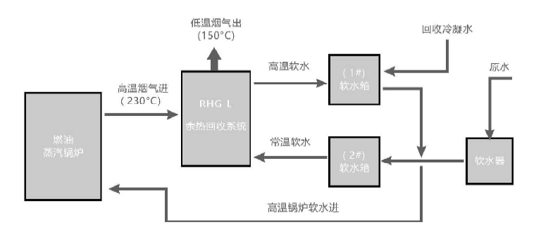 采用RHG-L烟气余热回收系统回收锅炉烟气余热,回收的热量用来加热锅炉用软水,减少锅炉的燃油耗量。
