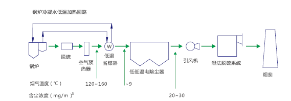本项技术是采用发明专利产品的低温型RHG-L余热回收模块,降低烟气温度时,回收的热量可用于加热误炉补给水或汽机冷餐水,提高锅炉系统的热效率,节约煤炭消师,在具有很好节能效果的同时,利用烟气,粉尘等特性改变让比电阻在10°-10"之间,实现更好的除尘效果。
